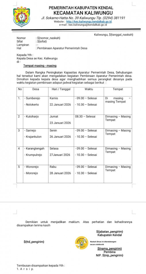 Dalam rangka peningkatan kapasitas aparatur pemerintah Desa di Kecamatan Kaliwungu diadakan oleh Camat Kaliwungu dan Jajarannya di Desa Sumberejo pada hari Kamis 22 Januari 2026 jam 09.00 Wib - Selesai.